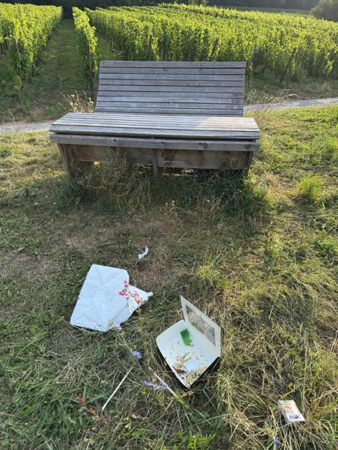 In der neuen Rubrik „Muss das sein?“ möchte ich immer wieder mal auf Situationen oder Begebenheiten hinweisen, die Anlass zu Ärgernis oder Beschwerden führen können. So zum Beispiel auf die Tatsache, dass Abfall einfach in der Landschaft liegen gelassen wird, zumal in unmittelbarer Entfernung Abfallbehälter bereitstehen. Das Bild zeigt ein solches Verhalten an der Relaxbank auf dem Weg zum Stutzparkplatz. Muss das sein? NEIN.
