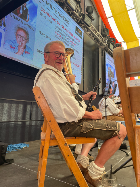 Das zweite Ereignis ist der Start der Michelsmess am vergangenen Freitag. Neuer Festwirt, neues Festzelt an alter Stelle – nichts ist so beständig wie der Wandel. Einer der seit Jahrzehnten auf der Bühne im Festzelt zu sehen und zu hören ist, ist der Börscheter Vollblutmusiker Burkhard Meisenzahl. Sei es am Eröffnungstag mit den „Original Staffelbrunser Musikanten“, bei der „Stadtkapelle Miltenberg“, am Freitag mit der „BBC“ beim Frühschoppen oder am Samstagvormittag mit den „Fränkischen Rebläusen“ – ohne Burkhard geht nix.