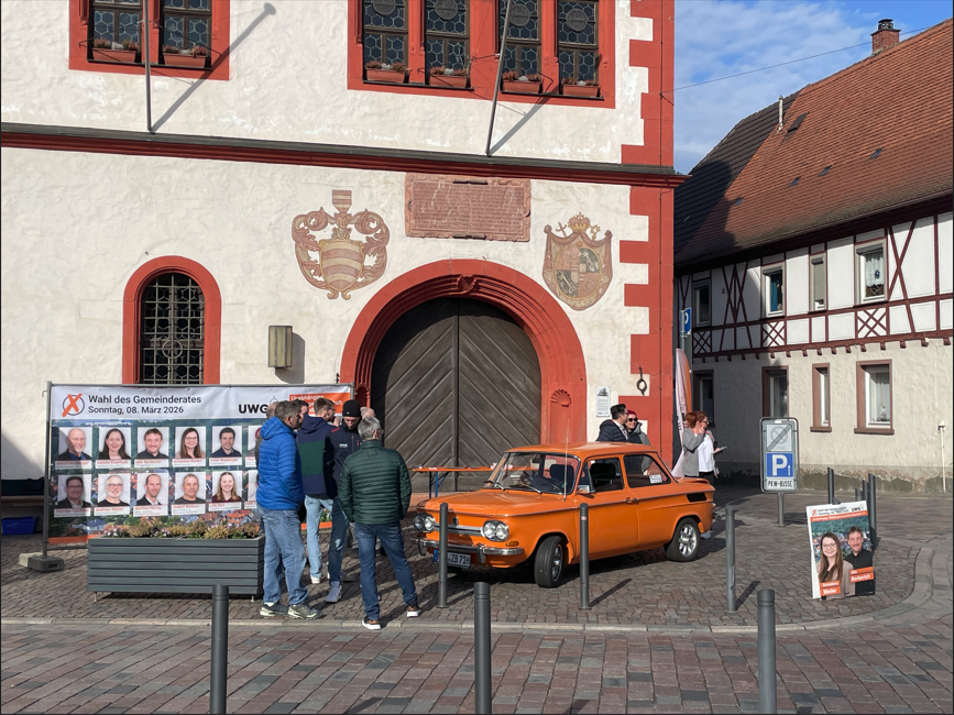 Der Abschluss der Wahlkampagne war am Samstag, 28. Februar der UWG-Infostand vor dem Rathaus. Zum zusätzlichen „Hingucker“ wurde der NSU Prinz aus dem Jahr 1971, den uns Dieter Braun direkt vors Rathaus gestellt hat. Bei schönstem Wetter waren die UWG-Kandidaten für den neuen Gemeinderat anwesend und wir kamen mit etlichen Bürgerinnen und Bürgern ins Gespräch.
