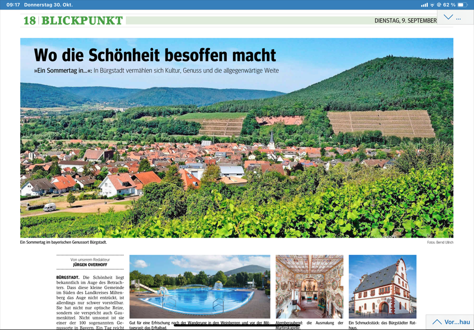 „Wo die Schönheit besoffen macht“… Mit dieser Überschrift im Main Echo beginnt der Artikel von Jürgen Overhoff über unsere Marktgemeinde, der am 9. September erschienen ist. Overhoff schwärmt geradezu von dem, was Börschet alles zu bieten hat. Und was soll ich sagen – wo er recht hat, hat er recht. In unserer Heimatgemeinde zu leben, ist einfach toll und ganz viele Einheimische und Gäste fühlen sich hier sehr wohl. Nur kommt das nicht alles von ungefähr. Es bedarf sowohl in der Vergangenheit als auch in der Zukunft der Anstrengung vieler engagierter Bürgerinnen und Bürger, aber auch den Gewerbetreibenden, Bürgstadt zu dem zu machen, was es ist.