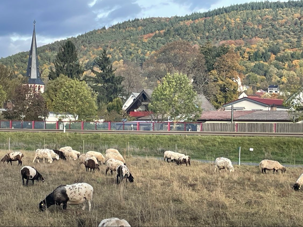 Mit einem Foto von grasenden Schafen auf einer Wiese zwischen Umgehungsstraße und Main wünschen wir euch einen farbenfrohen und erkältungsfreien November.