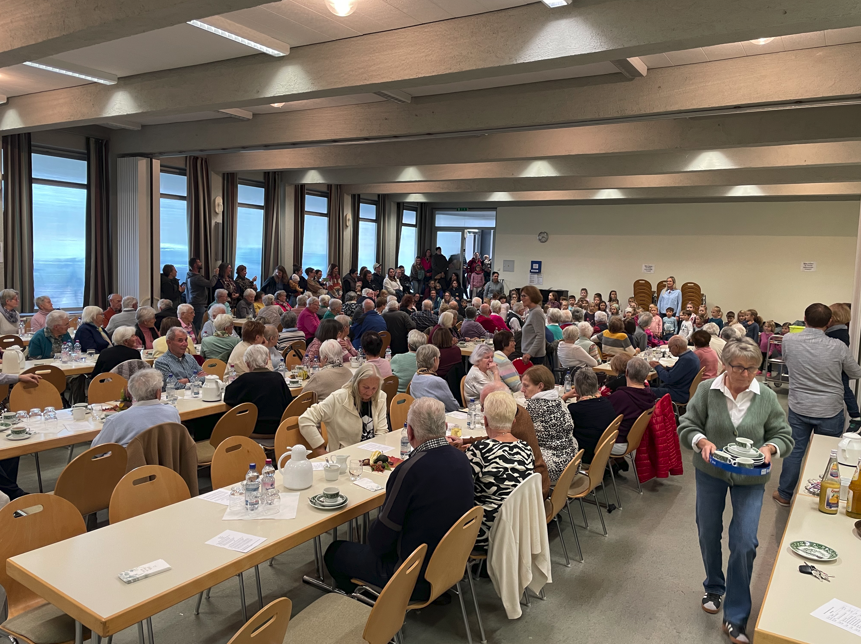 Am Mittwoch, 22. Oktober fand der jährliche Seniorennachmittag im Pfarrsaal statt. Michael Schmitt für die Pfarrgemeinde und ich als 2. Bürgermeister konnten über 100 Gäste willkommen heißen. In einer kurzen Andacht widmete sich Pfarrer Albrecht Kleinhenz dem Thema Schöpfung. Nach Kaffee und Kuchen ging die Eingangstüre auf, 40 Kindergartenkinder strömten herein und sangen, sehr zur Freude der Senioren, zwei Lieder. Wenn zeitgleich vier Generationen zusammenkommen, ist das schon was sehr Schönes und das ging manchem sichtbar nahe. Mit dem Bürgstadter Heimatlied, angestimmt von der BBC die den Nachmittag musikalisch und mit launigen Ansagen umrahmte, endete ein wunderschöner Nachmittag. Vielfach wurde der Wunsch an unsere Quartiersmanagerin Jessica Breunig herangetragen, auch im nächsten Jahr einen Seniorennachmittag zu organisieren.